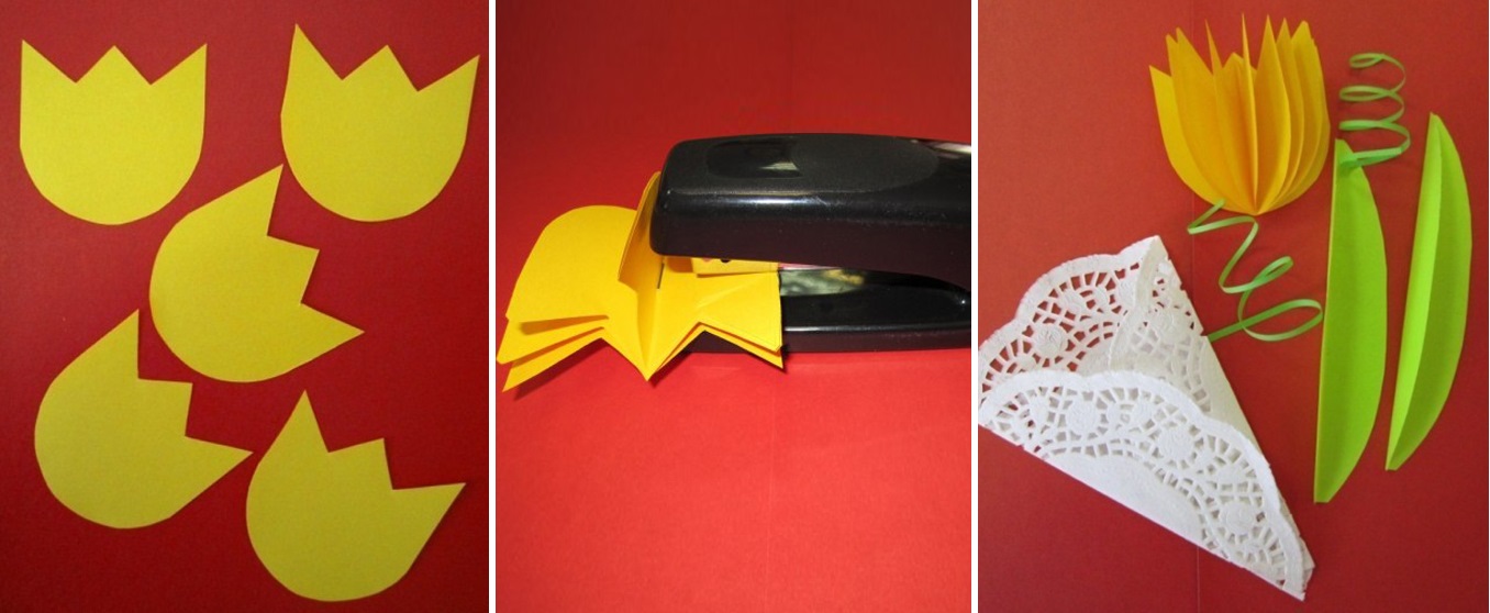 Существует множество вариантов изготовления поздравительных открыток и сувениров с тюльпанами. Предложенные варианты не являются сложными в исполнении и носят лишь наглядный характер. Вы же в свою очередь можете их брать лишь за основу, внося свои авторские элементы и различный декор. В любом случае, работа, сделанная своими руками, будет эксклюзивной и творческой.
