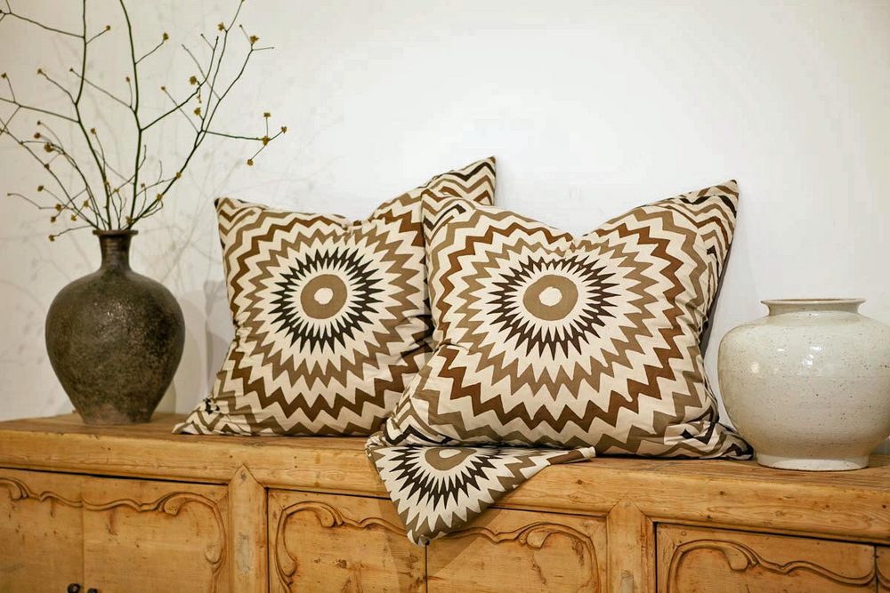 В современном интерьере уместнее окажутся геометрические принты, шеврон, горизонтальные полосы, абстрактные картинки.