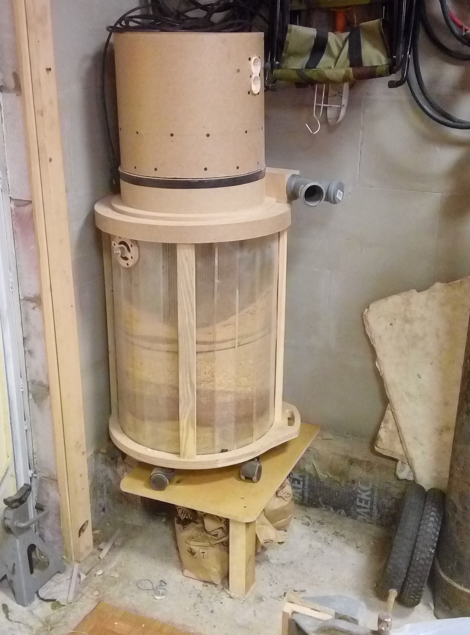- Сепаратор. Корпус конструируют также из прочной фанеры или ДСП, с использованием фрезерного циркуляра. Стенки выполняют из фанеры, с толщиной стенок 3–4 мм. Для изготовления патрубка можно использовать сантехтрубу на 50 мм. В боковое отверстие сепаратора, по касательной поступает воздушный поток с механическими отходами и пылью, после чего центробежная сила проталкивает их через прорезь внутрь бочки.
