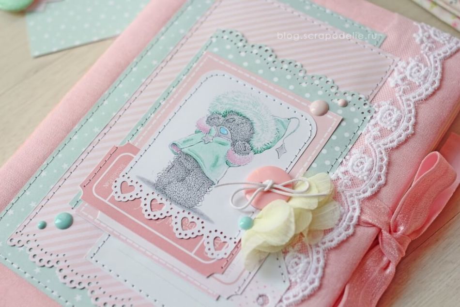 Наиболее подходящая техника для работы – скрапбукинг, который включает в себя вырезание, приклеивание, комбинирование, составление композиций при помощи декоративных материалов: дизайнерской бумаги, кружева, сеточки, сушеных букетов, листьев, жемчужин, страз, вырезок и ленточек. В зависимости от того, девочка у вас или мальчик, вы можете подбирать цвета и стили.