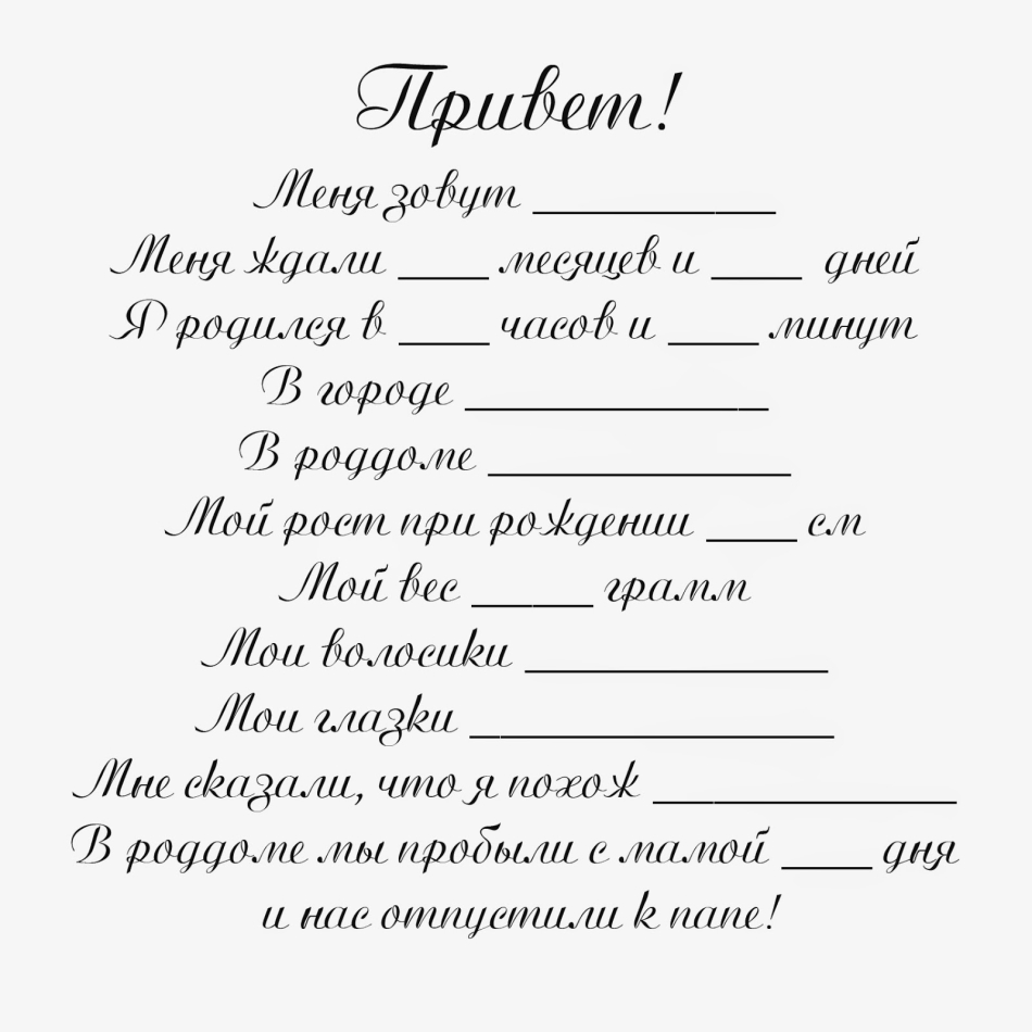 Здорово, если это будет почти сразу после родов. Можно рассказать, как малыш родился, во сколько, как радостно светило солнышко в этот день, или что был сильный мороз, но рядом с мамочкой было очень тепло и уютно (можно вырезку из газеты этого дня с погодой приклеить). Сколько детеныш весил и какого был роста. Кто был в этот момент рядом. Или как папа стоял под окнами и ждал, а потом прыгал от радости и писал слова благодарности на асфальте.