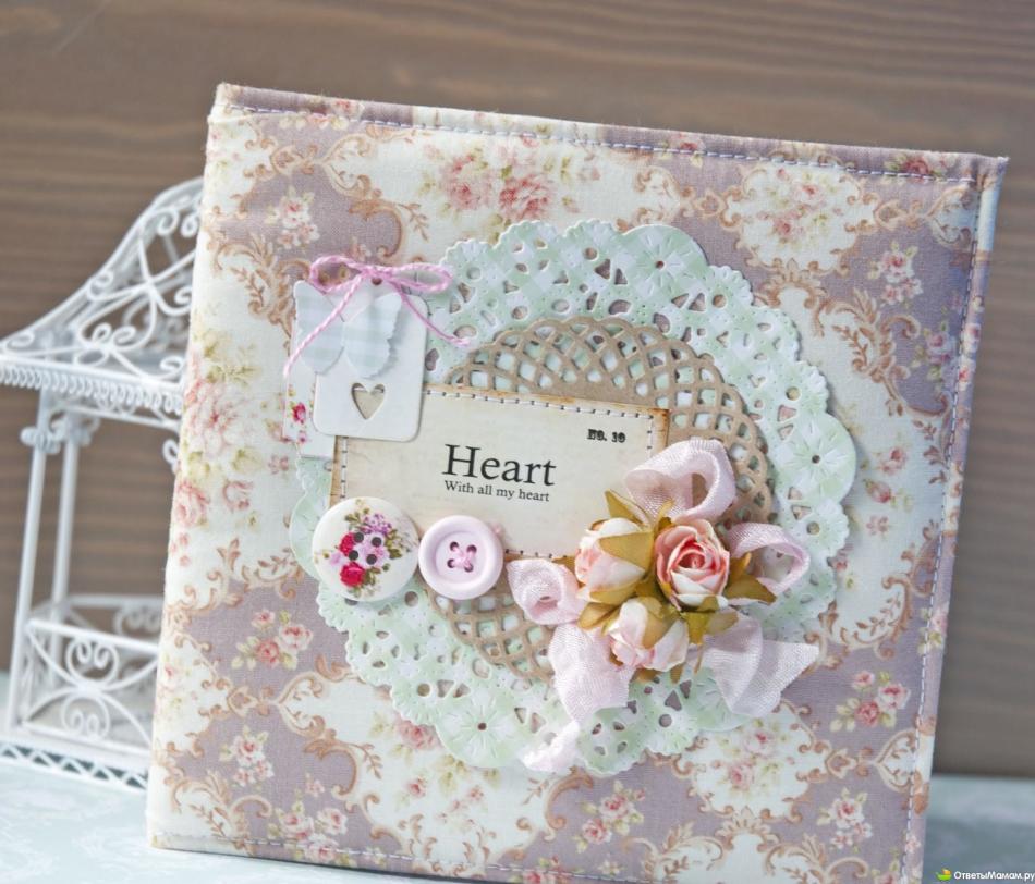 Каждую деталь декора вы можете пришивать или приклеивать, создавая многослойные украшения на обложке. Вы также можете вырезать картинки из старых открыток, распечатать на принтере стихи или красивые высказывания о детях, любви и семье.