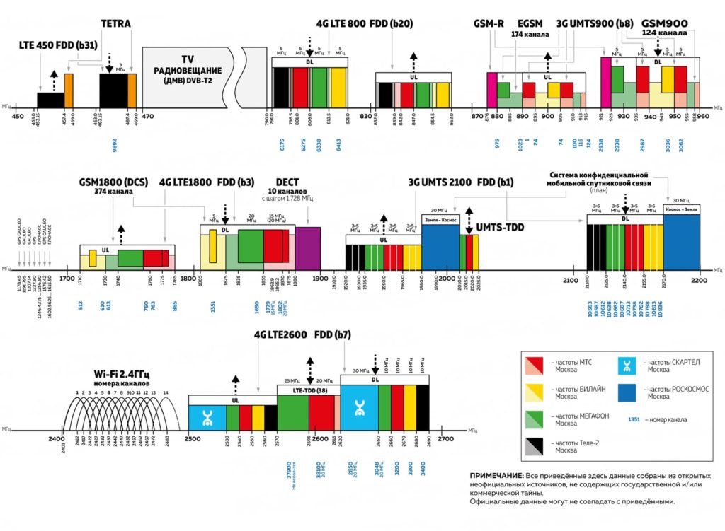В каждом из них используется две частоты: Uplink и Downlink. Первая из них обеспечивает связь от телефона к вышке. Вторая обеспечивает приём сигнала на телефоне
