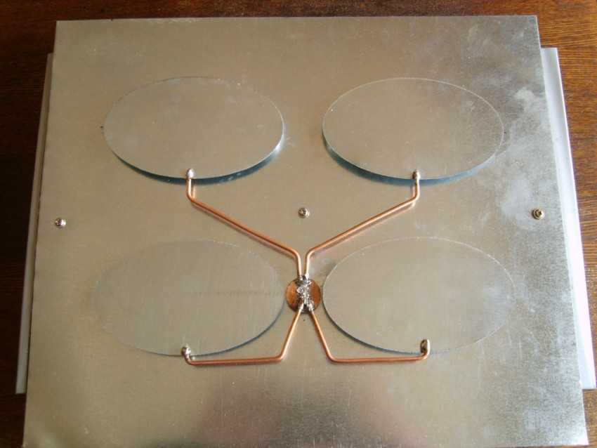 Закрепите «восьмёрку» прямо по центру рефлектора на расстоянии 3,6 см. Панель и проволока не должны соприкасаться.