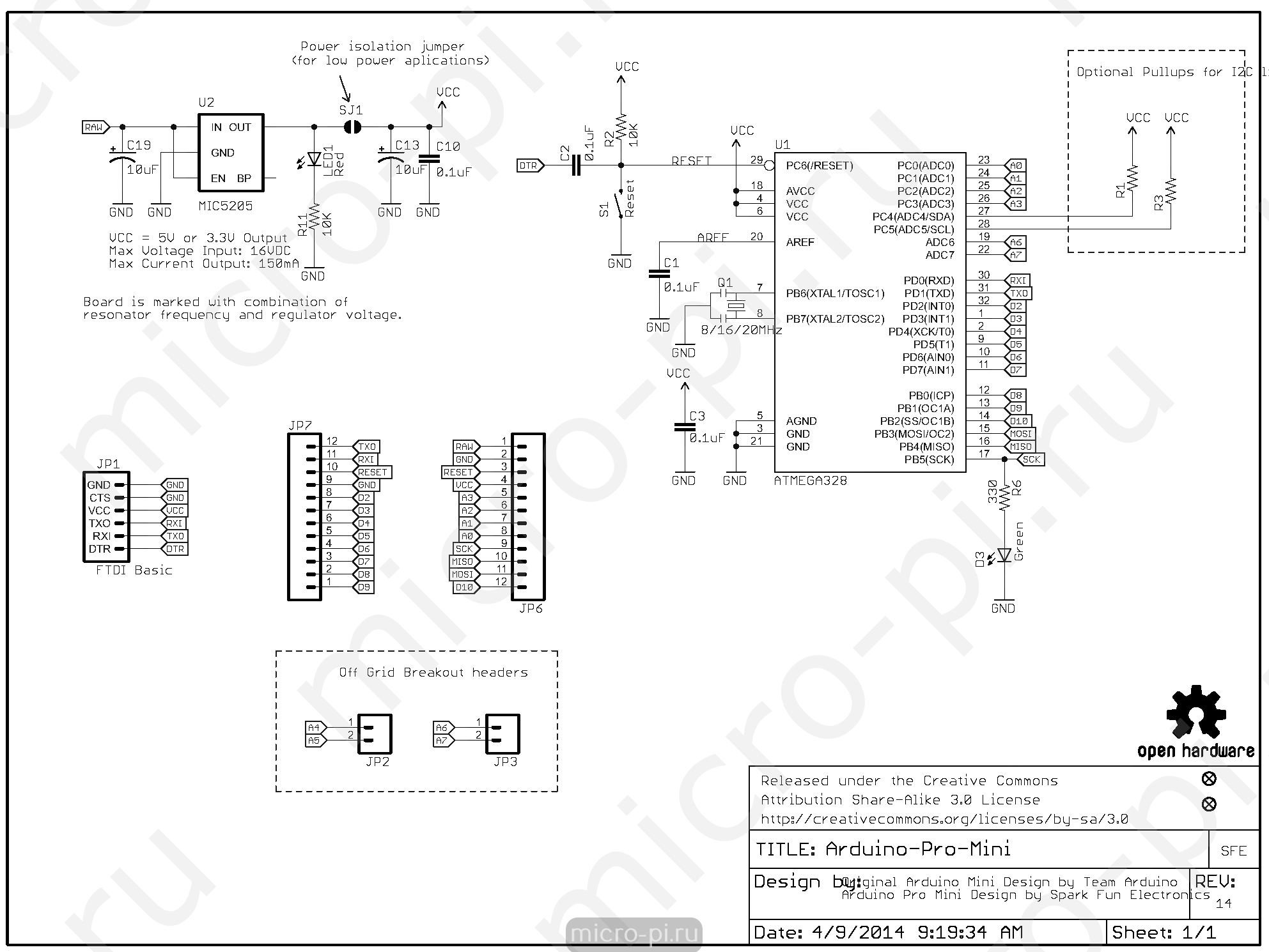 - Последовательная шина: 0 (RX) и 1 (TX). Выводы используются для получения (RX) и передачи (TX) данных TTL. Данные выводы имеют соединение с выводами TX-0 и RX-1 блока из шести выводов.