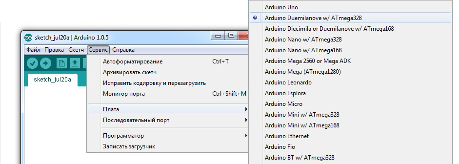 После этого нужно выбрать плату, для которой нужно прошить загрузчик. Это делается в меню Сервис >> Плата.