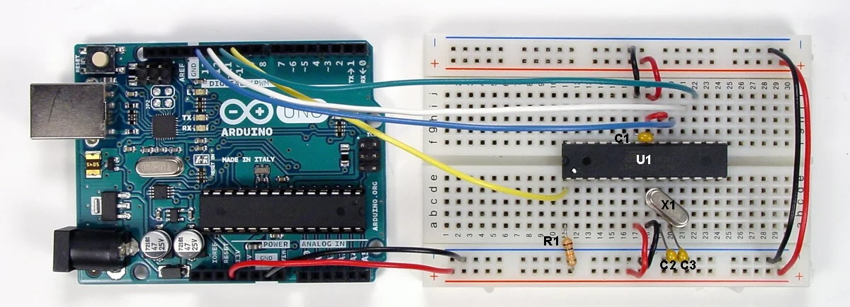 Чтобы загрузить код загрузчика из Arduino Uno в пустой ATmega328P-PU, потребуется небольшая схема прошивки загрузчика. Комплектующие, необходимые для схемы загрузчика, перечислены ниже (вам может также понадобиться несколько перемычек).