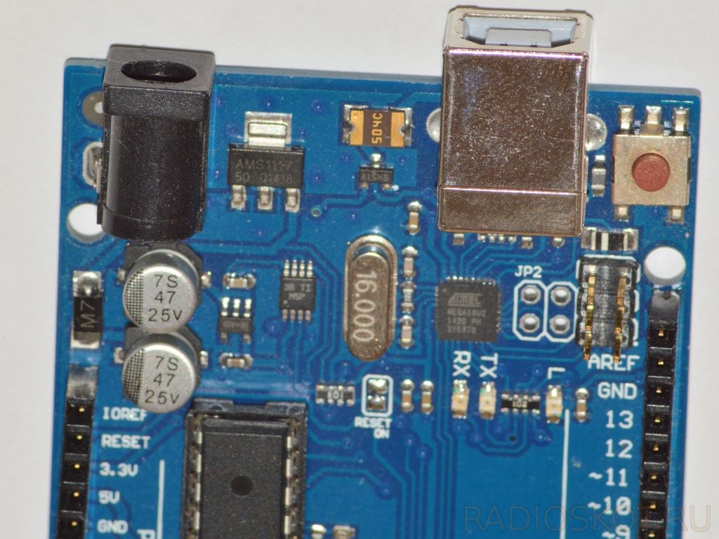 На плате имеются четыре светодиода – индикатор питания (обозначен, как ON), светодиод, подключенный к 13 порту (L), два светодиода индикации обмена данными через последовательный порт (TX и RX). Также на плате имеется кнопка для перезагрузки микроконтроллера.