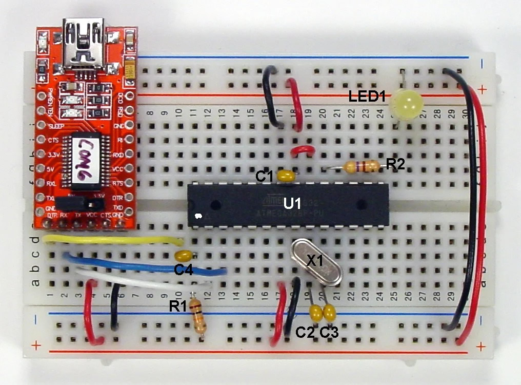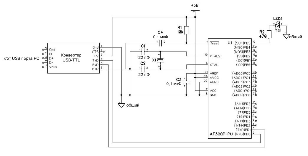 Преобразовать схему прошивки загрузчика AT328P-PU в простейшую схему программирования и проверки работоспособности довольно просто. Ниже приведены принципиальная схема и фотография макета.
