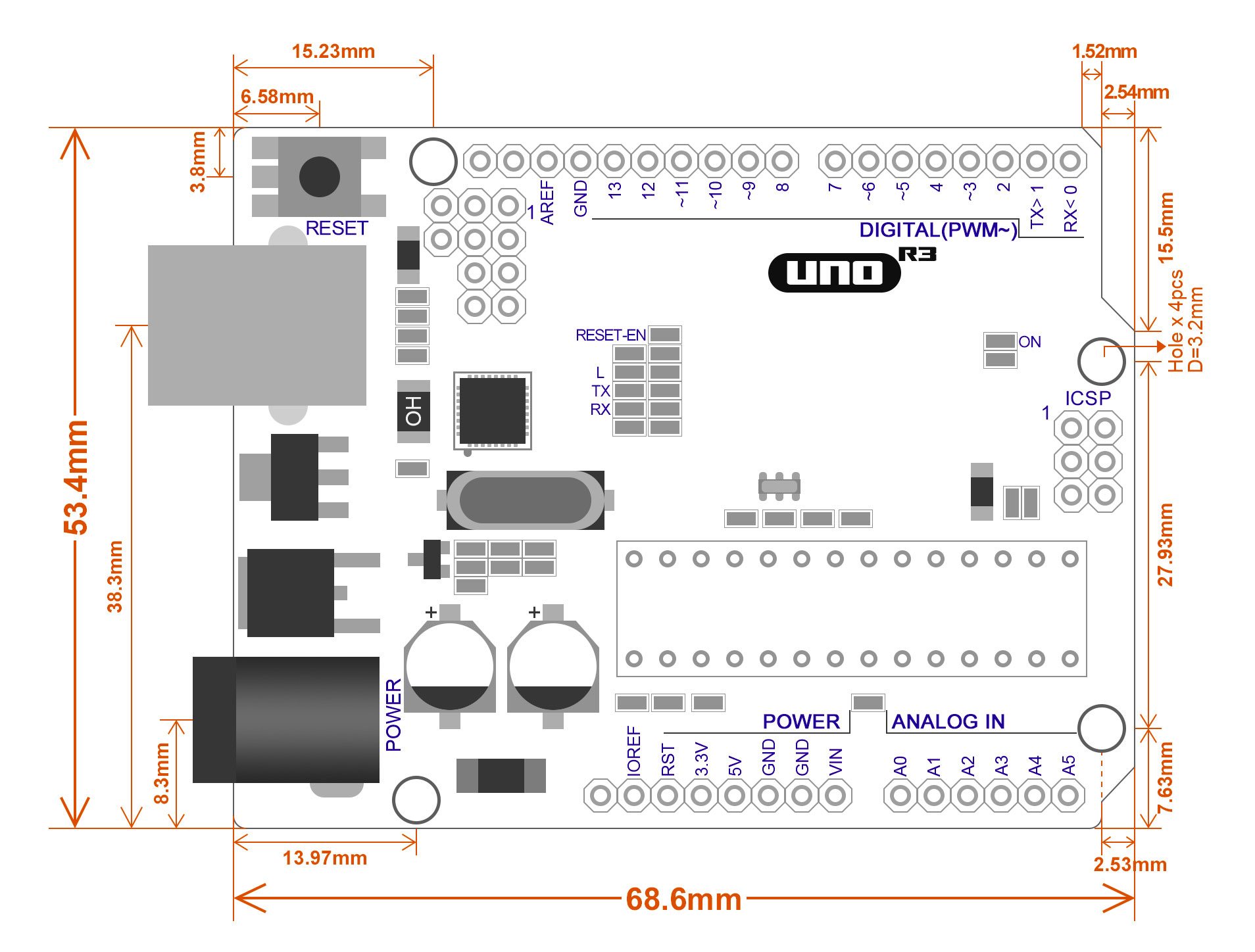 Размеры платы представлены на схеме ниже. Общие размеры Уно составляют 53,4 мм на 68,6 мм.