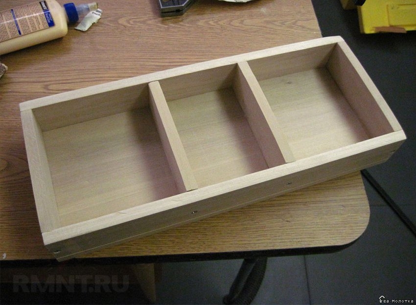 Скрепите заготовки корпуса переносной части. Поставьте на место разделительные перегородки, прикрутив их шурупами с боков и снизу.