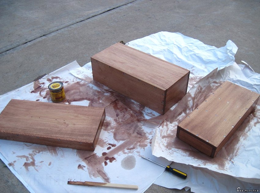 Все подготовленные элементы отшлифовать, собрать коробку прямоугольной формы. Чтобы конструкция не разваливалась, места креплений и торцы заготовок промазываются клеем. Дополнительно ящик сбивается маленькими гвоздями или скручивается шурупами.