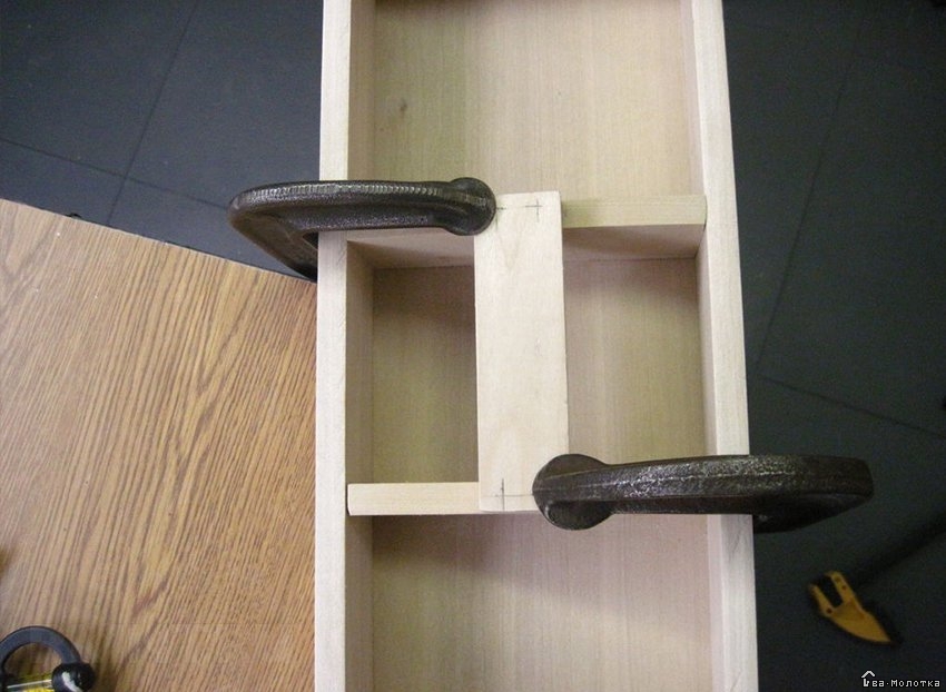 Из брусочков делаются накладки для ручки. Углы заготовок обрабатываются рубанком и шлифовальной шкуркой, крепятся клеем или гвоздиками. Из деревянных реек, обрезанных в размер перегородки, нужно сделать держатели, которые размещают горизонтально на перегородке. Для отвёрток дрелью высверливаются подходящие отверстия. В прямоугольные пазы помещаются плоскогубцы, кусачки и т.д.
