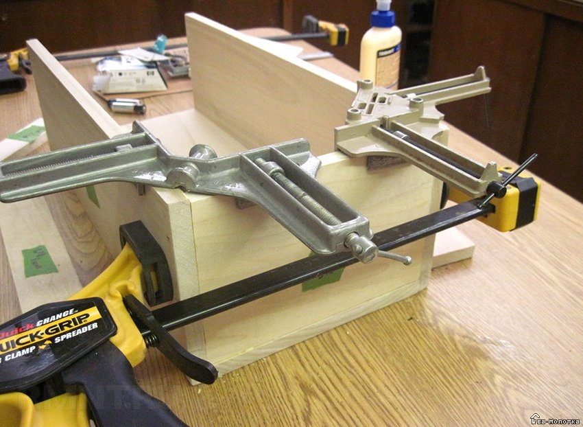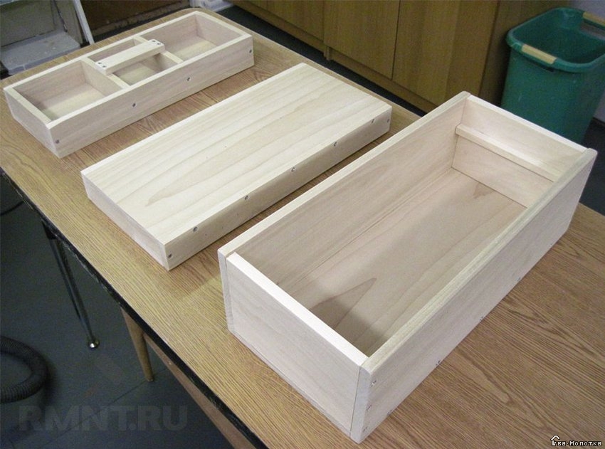 Внутренние соединения усиливаются путем вклеивания брусков прямоугольного либо треугольного сечения на стыках между стенками, боковинами и днищем. Бруски дополнительно закрепляются винтами или гвоздями.