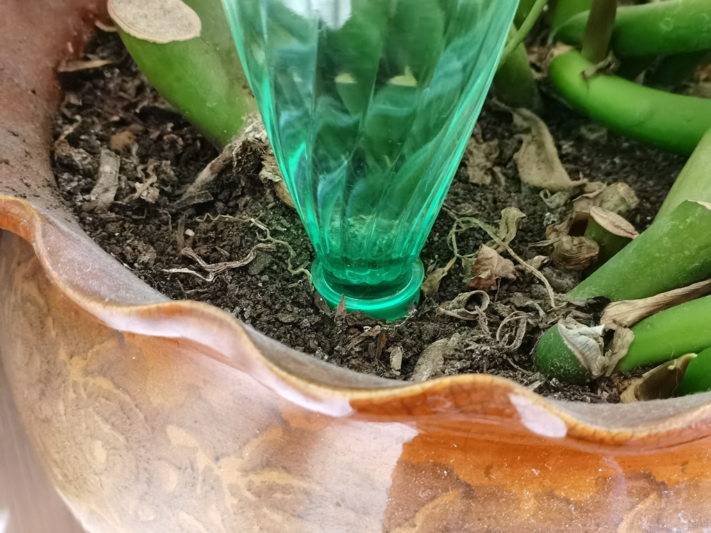 Для маленького горшка хватит бутылки в 0.5 литров, для больших кашпо – подойдет емкость от 2 до 5 литров.