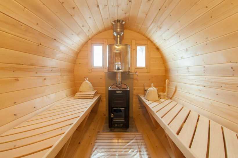 Печная труба в таких конструкциях подводится непосредственно под крышу либо через торцевую стену. Конструкция мобильных передвижных бань-бочек может отличаться наличием основания на колесах, причем такие детали могут иметься как в строении с формой по типу овала, так и в квадратных конструкциях с округлыми углами (баня-квадро). В большинстве случаев входные двери устанавливаются с торца, но встречаются и строения с входом сбоку.