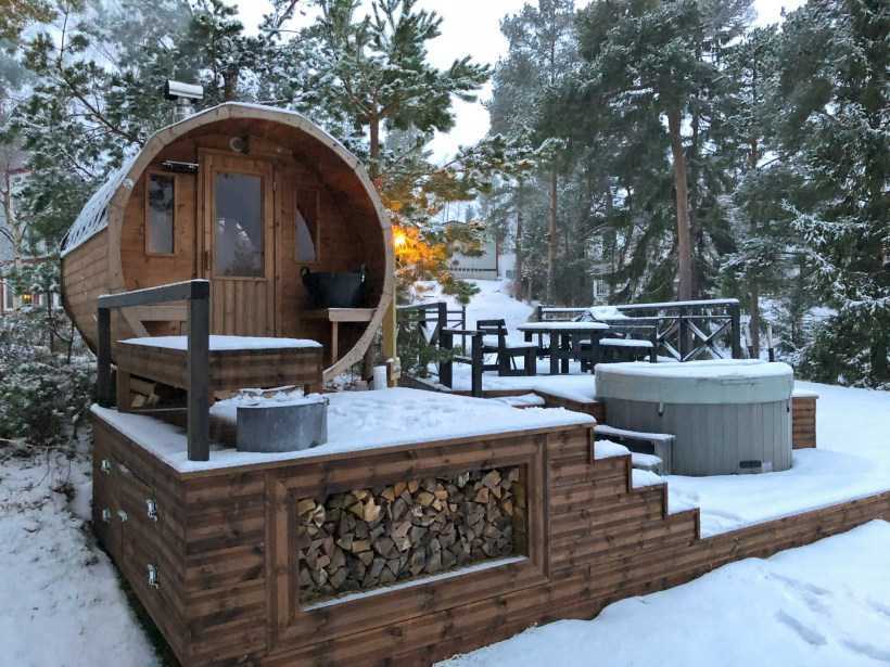 Если для нашей страны баня-бочка – ноу-хау, то совершенно привычна такая конструкция парной в Финляндии и окружающих скандинавских странах. По сути, это бочкообразный сруб из хвойных пород дерева с переносной печкой-парогенератором. Последняя может работать как на электричестве, так и на дровах.