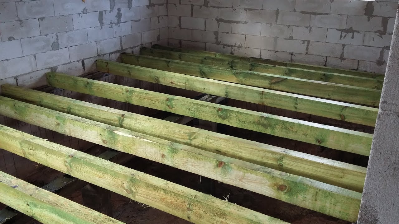 Там, где запланировано место под помывочную и парную комната, должна быть убрана почва с уклоном 5-10 градусов в сторону слива, а сверху засыпанная слоем щебня на 5-10 см. Армированная сетку слоем сверху заливается бетоном и можно класть брусья (половые лаги), заранее обработанные антисептиком от гниения. Затем прокладывается чистовой пол из строганной доски, по периметру прибивается плинтус.