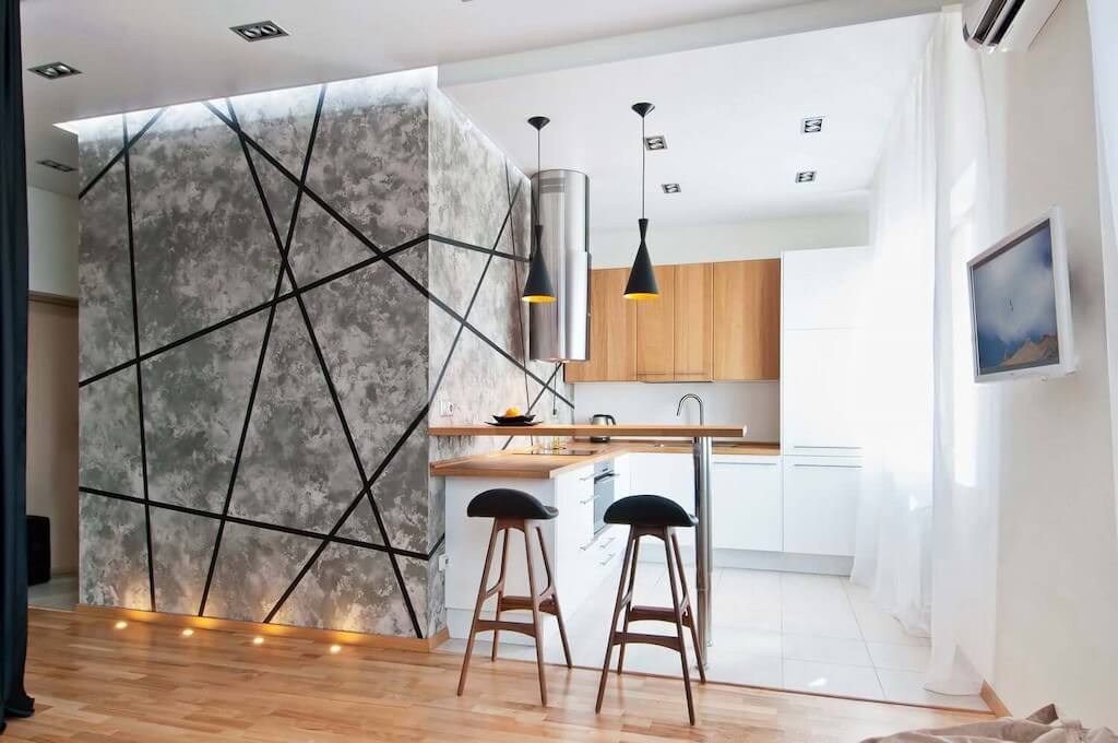 Кухня-гостиная без верхних шкафов с барной стойкой. Вероятно, она сделана из гипсокартона и облицована искусственным камнем, играет роль перегородки