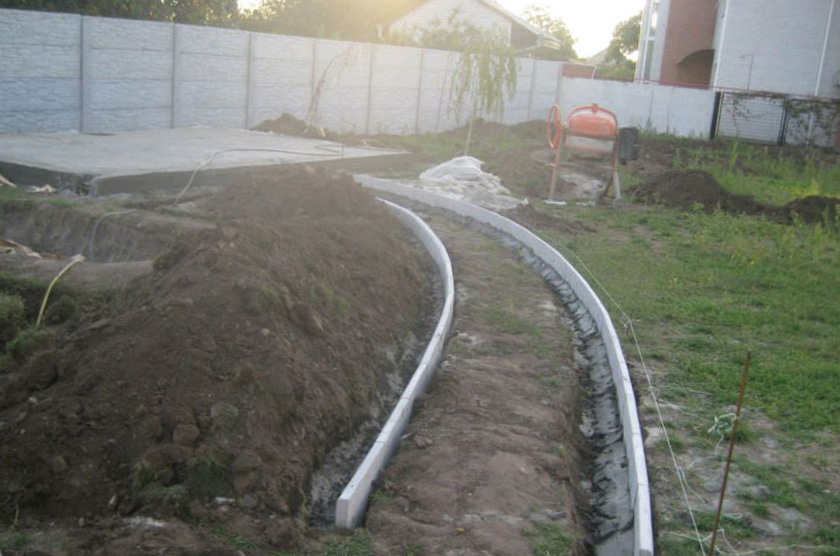 - Сначала необходимо выкопать углубление. Следует снять слой грунта в 15 см. Для этого достаточно использовать обычную лопату. Стремиться к идеально ровному основанию, тоже не стоит. Главное, чтобы глубина траншеи была не менее 15 см.;