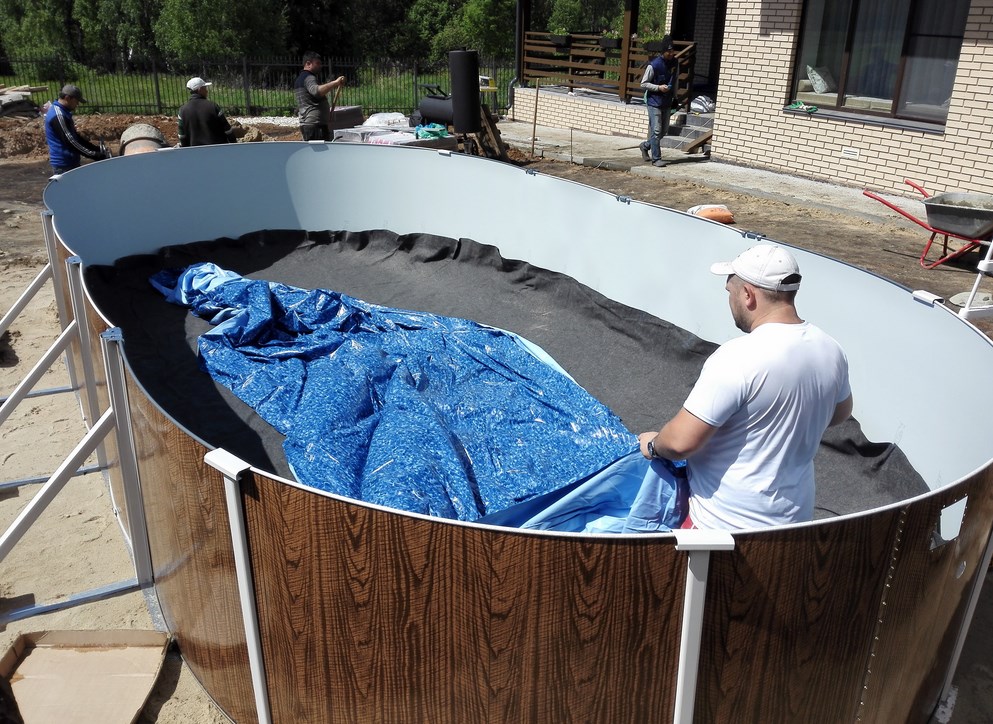 При сборке каркас устанавливается на горизонтальную ровную поверхность. Пленка, раскроенная по форме бассейна, укладывается внутрь и фиксируется по краям. Вода заливается в емкость с помощью шлангов. Объем купели может быть от сотен литров до десятков кубов.