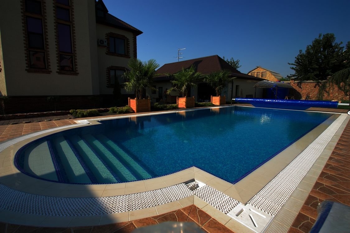 Кафель — оптимальный материал для покрытия внутренней поверхности бассейна. Он прочный, гладкий, гигиеничный и не гигроскопичный. К тому же, можно выбрать любую расцветку или даже выложить узор на свой вкус. Если не хотите возиться с кафелем — покройте дно и стенки бассейна пленкой из полихлорвинила. Как правило, пленки для бассейна окрашены в оттенки синего или голубого цвета.