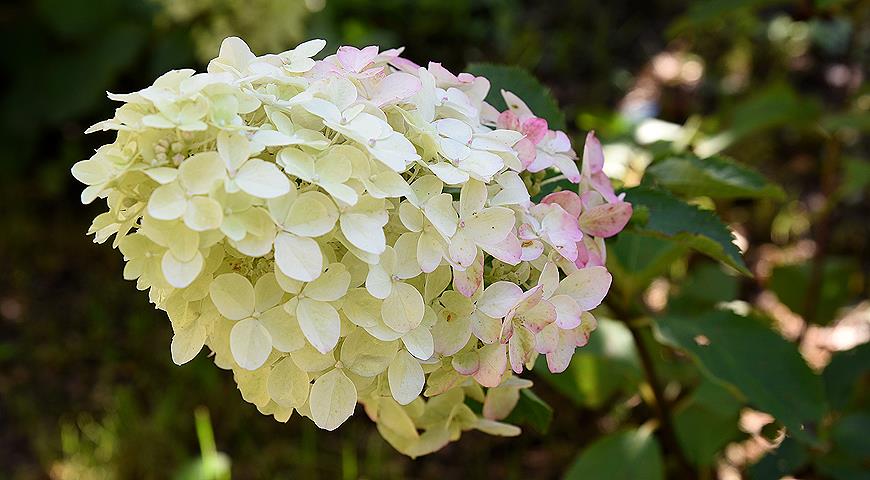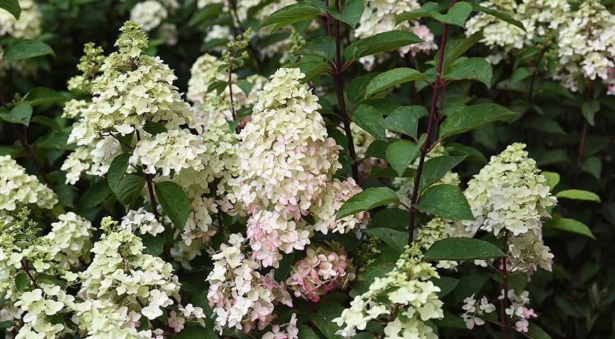 Один из самых популярных сортов. Куст высотой 2 м, соцветия крупные (40–50 см), плотные. Крупные стерильные цветки в начале роспуска белые, со временем низ соцветия становится красно-розовым, а верх остается белым.