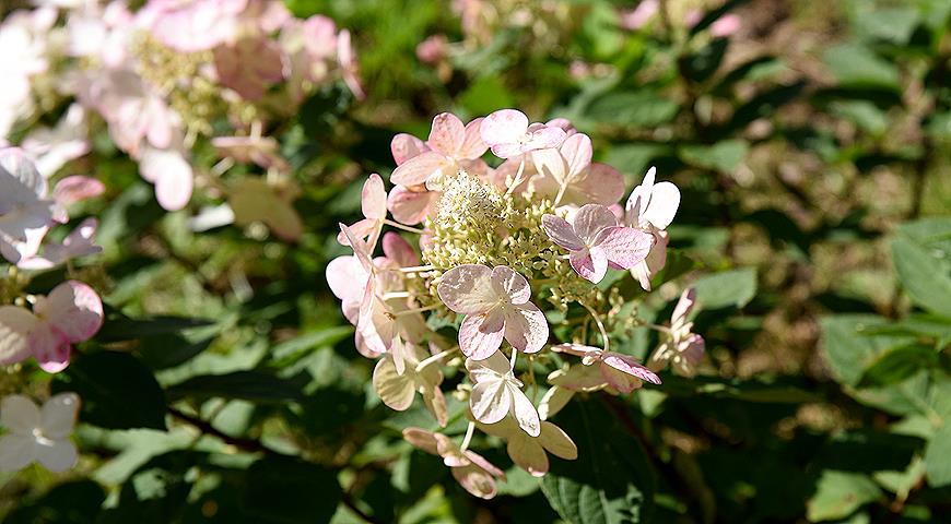 Или гортензия разноопушенная ― зимостойкий вид. В природных условиях в высоту может достигать 200–300 сантиметров. Зачастую применяют для образования штамбовой формы. Длина темных зеленых листочков около 20 сантиметров. Лицевая сторона у них гладкая, а изнаночная ― имеет опушение. Рыхлые соцветия щитковидной формы поначалу белые, а потом в конце цветения становятся розовыми. Цветение начинается в последние июньские дни либо первые июльские. Наиболее популярен почвопокровный сорт Бретшнейдера, который обильно цветет довольно большими соцветиями молочно-белого окраса.