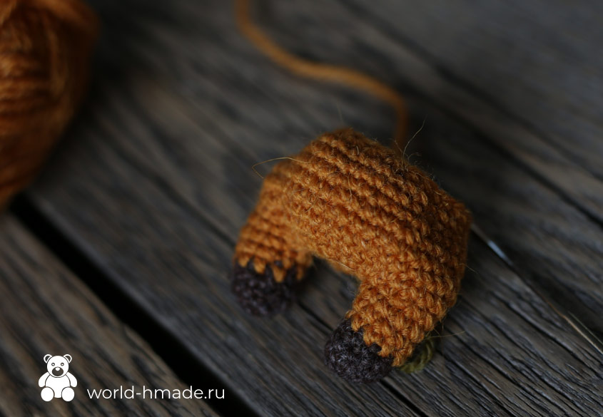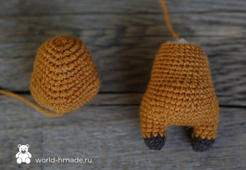 Вязать коричневым цветом, присоединить нить к голове, вязать по спирали.