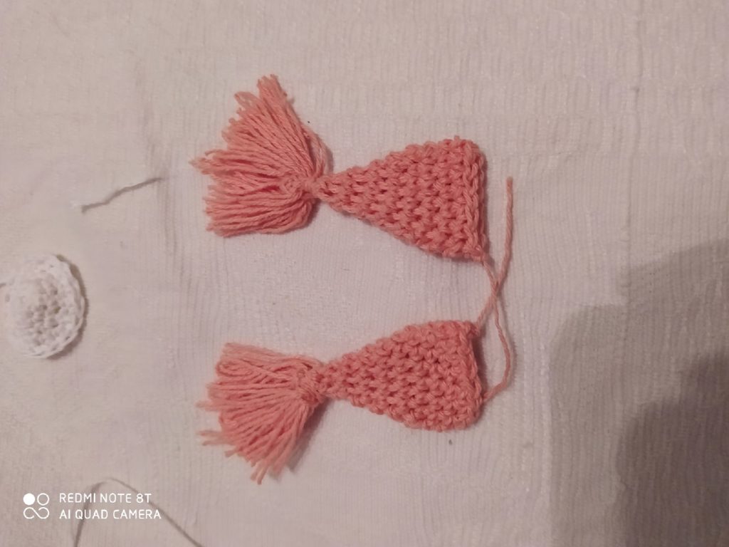 Ушки для белки имеют форму треугольника. Вязать нужно ушки с нижней части и постепенно убавлять петельки, придавая изделию форму треугольника. Вверху не до конца обрезаем нить. На ушки наклеиваем белую вату.