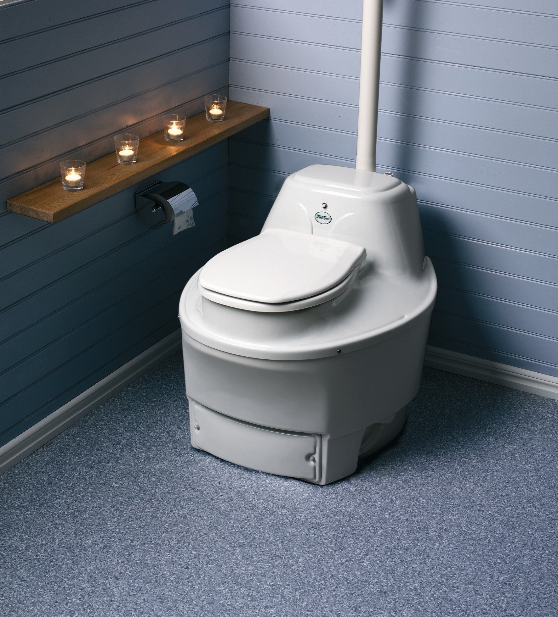 Конструкция на основе полипропилена, весом в 13 кг создана для стационарной установки. Существует требование по вентиляционным и дренажным сооружениям. Высота сиденья очень комфортная, напоминает обычные унитазы (40 см). Нагрузка ограничена весом в 150 кг. Накопительная часть с внушительным объемом в 50 кг не требует частого опорожнения (до 2-4 месяцев). Работает туалет по принципу разделения урины и кала, первая составляющая выводится, вторая высыхает.
