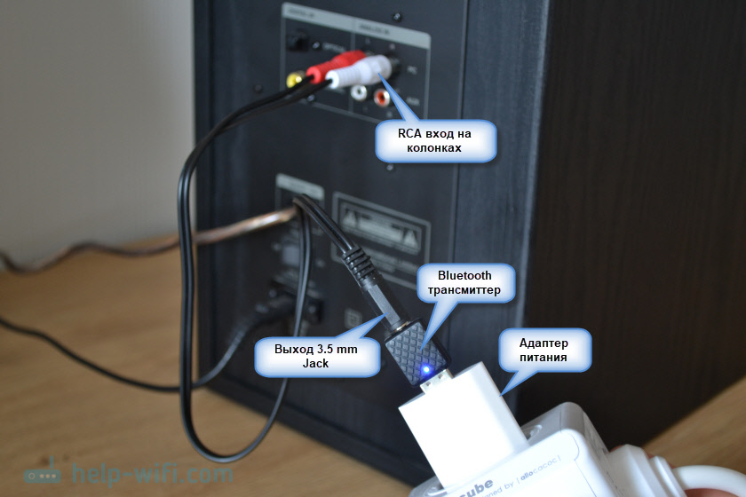 Показываю, как это выглядит на практике. Подключаем трансмиттер к питанию и к колонкам. Проверяем, переключен ли он в режим RX (об этом писал выше, 4 пункт).