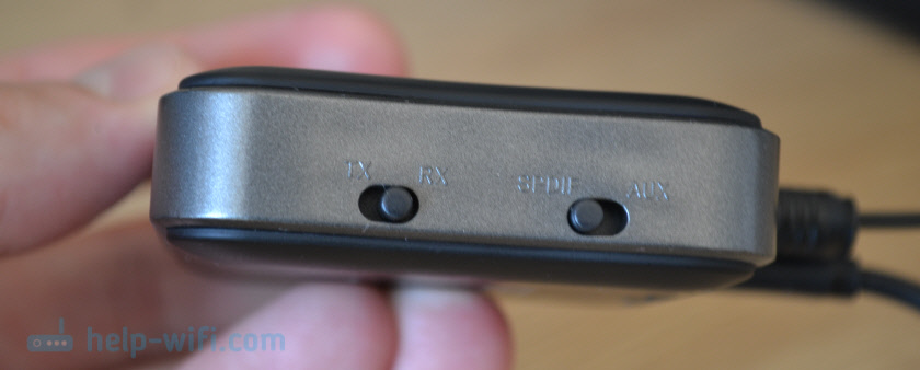 Напомню, что трансмиттер должен работать в режиме RX. Включаем его, и двойным нажатием на клавишу включения активируем режим подключения (делаем его видимым для других устройств). Индикатор должен активно мигать синим цветом. На вашем трансмиттере все может быть немного иначе, смотрите инструкцию.