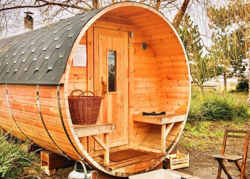 Самый большой минус сферической постройки заключается в ограниченном внутреннем пространстве. Обычно длина бочки колеблется в пределах от 2 до 6 м, высота – 2,2–2,5 м. Получившейся площади достаточно для одновременного нахождения 2–4 человек, но для многочисленных компаний данный вариант не подойдет.