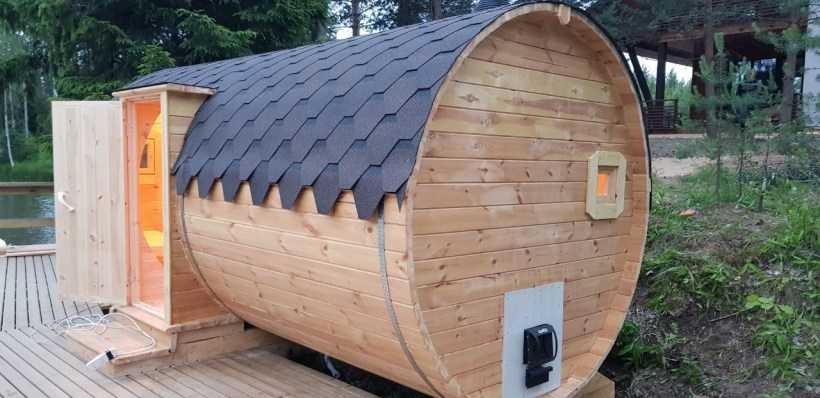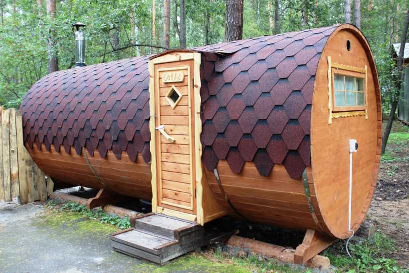 Полукруглая кровля в бане-бочке настилается из гибкой битумной черепицы. Ее расцветка может быть любой – по предпочтениям владельцев.
