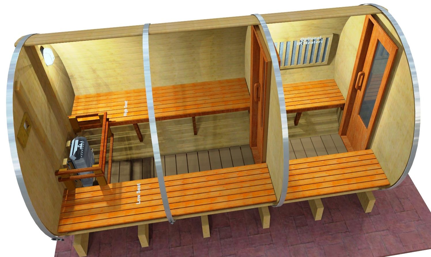 Самые большие бочки достигают 6 метров с небольшим. Здесь уже может быть до 3 комнат: раздевалка (с продуманным местом отдыха, столиком, вешалками для одежды, скамьями), помывочная (с душем или емкостями с водой), парная (с удобными скамьями лежаками); либо в случае сауны моечная может стать комнатой отдыха. В среднем, длина каждого помещения будет составлять 1-2 метра.