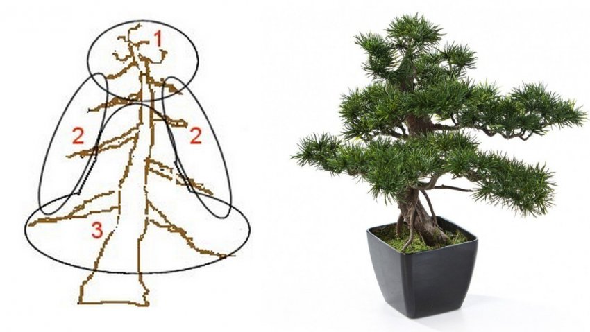 Само по себе выращивание бонсая невозможно, если неправильно подобрать растение. В данном случае сосна должна обладать мощным и устойчивым стволом, хорошо проявленным основанием и слегка вылезающими на поверхность корнями. Большое количество веток не является преимуществом, так как они легко могут нарушить гармонию объекта.