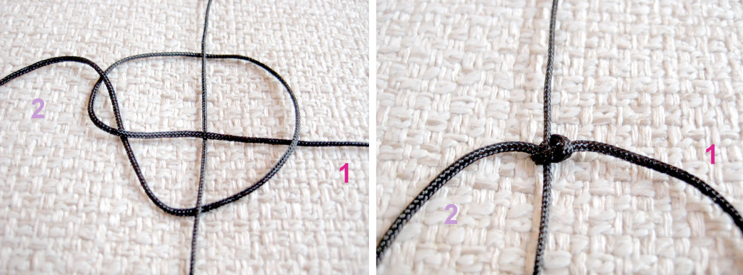- Аналогично делается противоположный правому узелок. Для этого левую нить кладут на основу и продевают под правой, а правую ведут под основой и закрепляют через левую петлю.