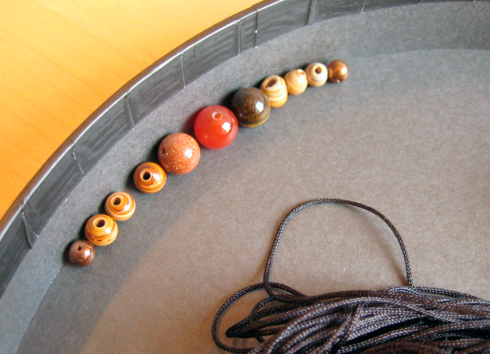 7. Теперь в каждый конец черного шнура вставьте по одной бусинке и завяжите по одному узлу. Закрепите клеем и отрежьте лишние части.