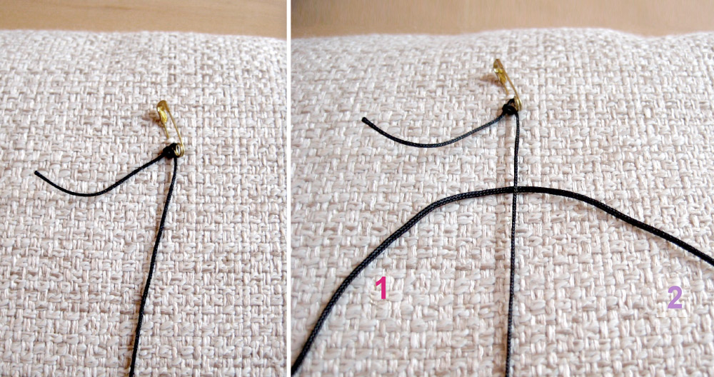 Закрепите нить длиной 30 см на подушке при помощи булавки: это наша основа. Метровая нить — рабочая, пропускаем ее под основой так, чтобы с каждой стороны оставалось по 50 см, и завязываем первый плоский узел.