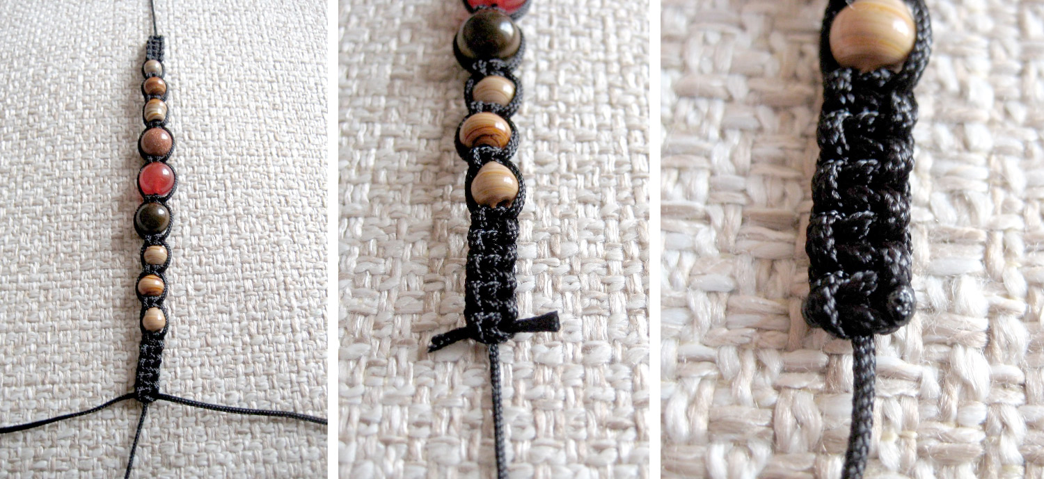 8. После того, как вы добавили 5-6 бусин, сделайте подряд 5-6 узлов. Закрепите последний узел суперклеем. После высыхания отрежьте концы, оставив лишь центральный шнур.