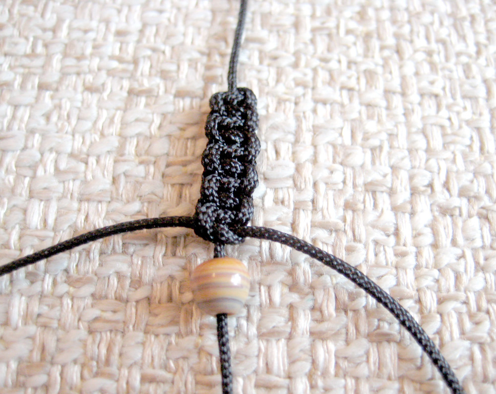 4. Когда вы уже сделали много узлов, добавьте одну бусинку. После этого можете продолжать делать узлы и добавлять бусины. Количество бусин не ограничено.
