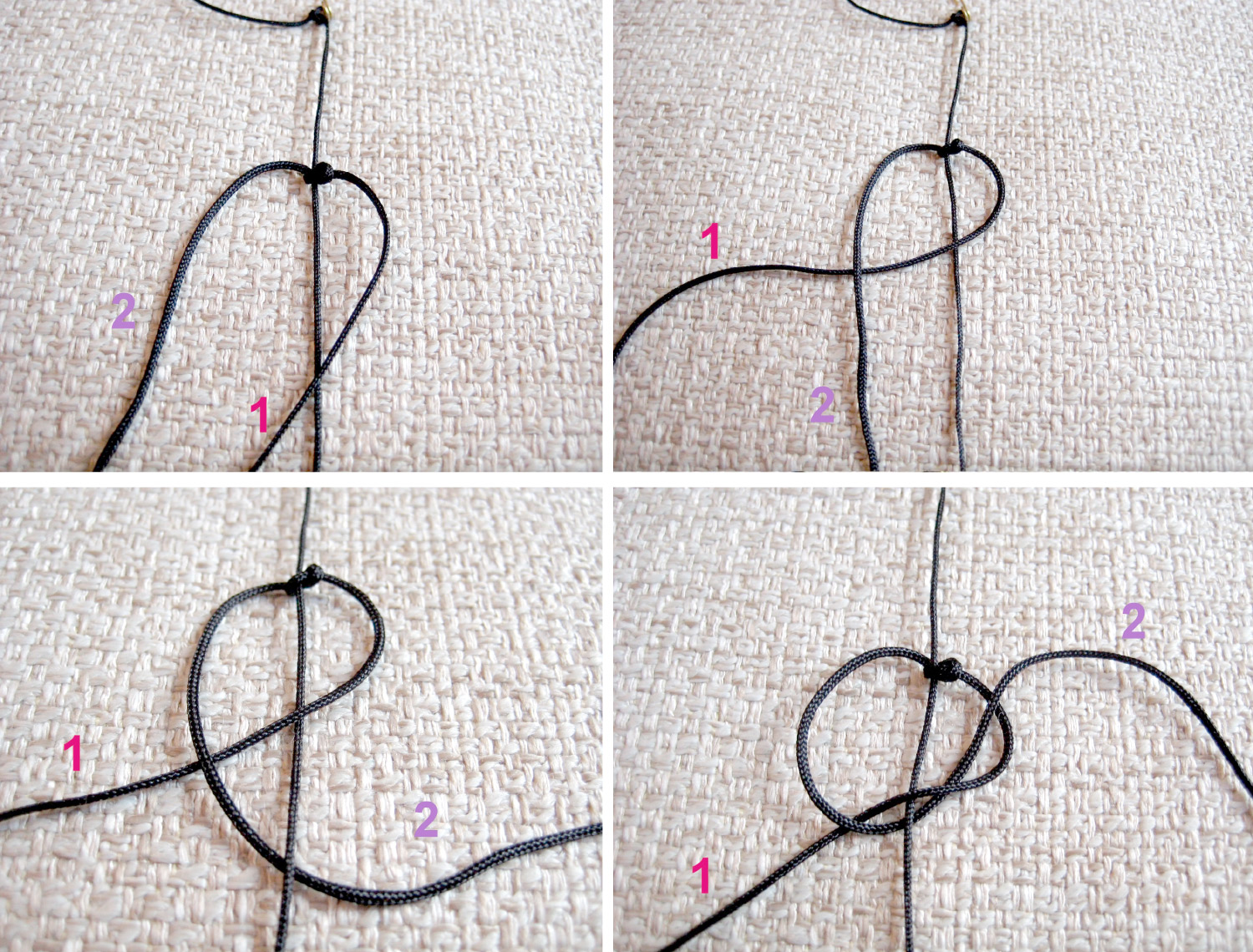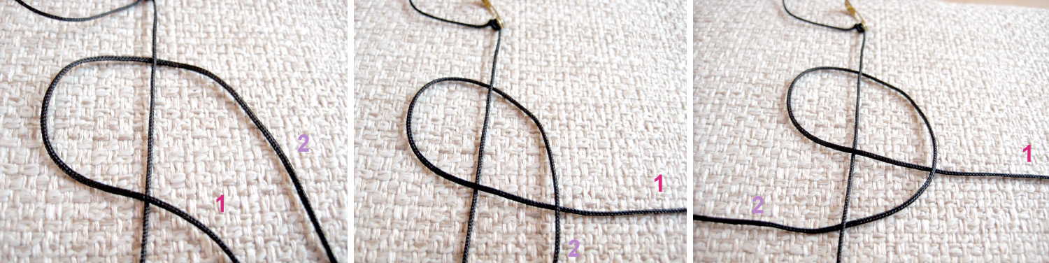 № 2 проводим вверх слева, в петлю нити № 1: получается, что № 2 проходит под № 1. Затягиваем.
