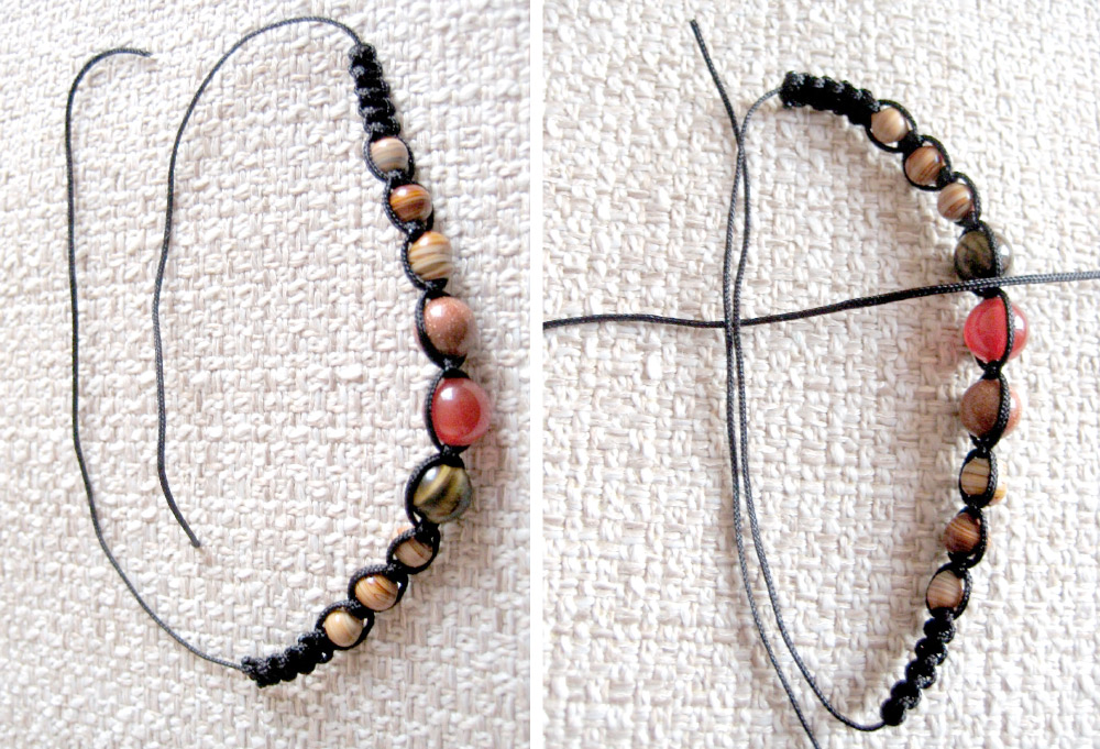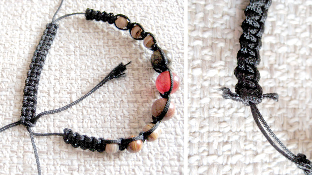 10. На концах браслета сделайте по одному простому узлу, добавьте по одной бусинке и снова завяжите по узлу. Удалите (при необходимости) лишние части шнура.