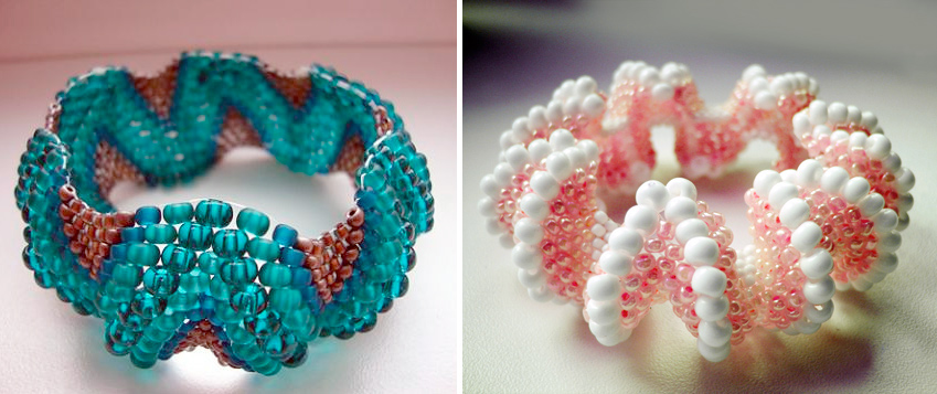 Наращивать такие ряды можно сколько угодно, пока не получится нарядный широкий браслет из бисера. Если заменить леску прозрачной резинкой, то плести изделие получится по кругу. Если же конструкция жёсткая, то для неё нужно припасти специальную фурнитуру для изготовления застёжки.