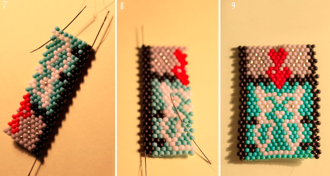 По окончании плетения остается только сшить украшение. Для этого совместите рисунок на двух краях, и прошейте обе стороны мозаичным плетением, соединяя их в кольцо.