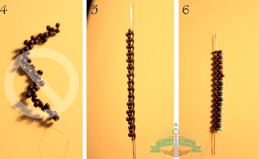 Когда ряд завершен, поворот выполняем маленькой бисериной (№ 1), и немного меняем порядок плетения. Теперь на иглу нужно нанизывать такую же бисерину, как та, в которую будем вводить иглу.