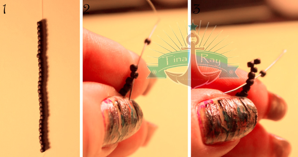 - Иглой необходимо поддеть 3-ью по счету бисерину с края.