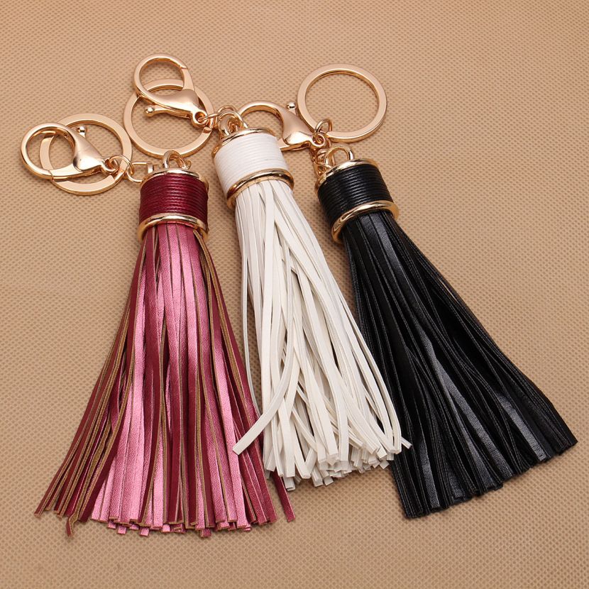 Очень стильный и простой вариант, получаемый сворачиванием прямоугольника с бахромой на концах в трубочку. Внутрь помещается кусочек кожи с карабином. Кстати, кожаными можно сделать любые брелочки простой формы из двух деталей.