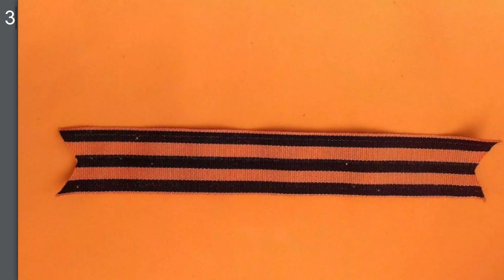 На последнем этапе нужно сделать основу броши из георгиевской ленты, у меня лента не атласная, а из какого-то материала, к сожалению, не знаю, какого, но это не важно, она может из любого материала, лишь бы георгиевская. Её нам потребуется 20-25 см